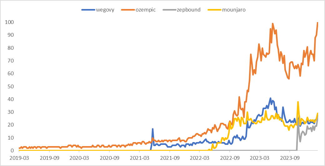 화제성에서는 Ozempic, Wegovy가 앞서가고, 효능은 Mounjaro, Zepbound가 조금 더 좋은 정도다.
