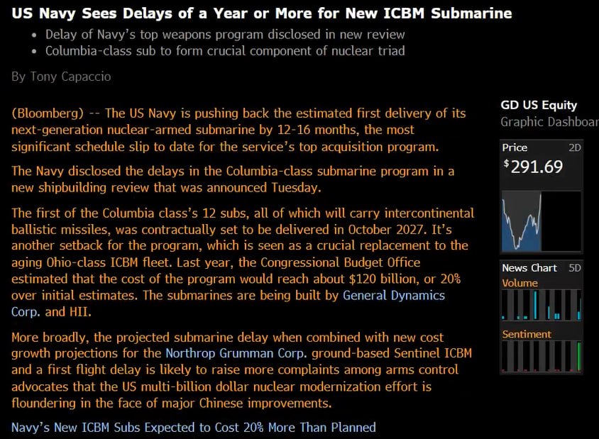 2012년 예산 기준으로 사실 첫 Columbia-class SSBN USS District of Columbia는 2019년 인도가 완료되었어야 했다. 그러나 이 계획은 계속해서 지연되어 2021년으로 밀렸고, 결국 2024년 4월 3일 Bloomberg 기사로 2027년 인도 예정이던 일정마저 2028년 말-2029년 초로 밀리게 된다.