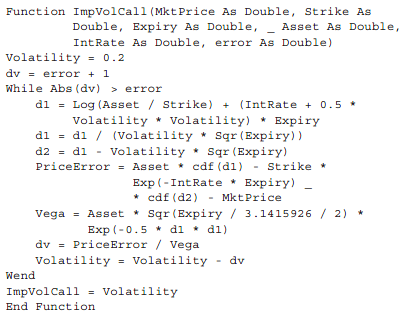If we can see the price at which the option is trading, we can ask ‘what volatility must I use to get the correct market price?’ This is called the implied volatility. The implied volatility is the volatility of the underlying which when substituted into the Black-Scholes formula gives a theoretical price equal to the market price. In a sense it is the market’s view of volatility over the life of the option.