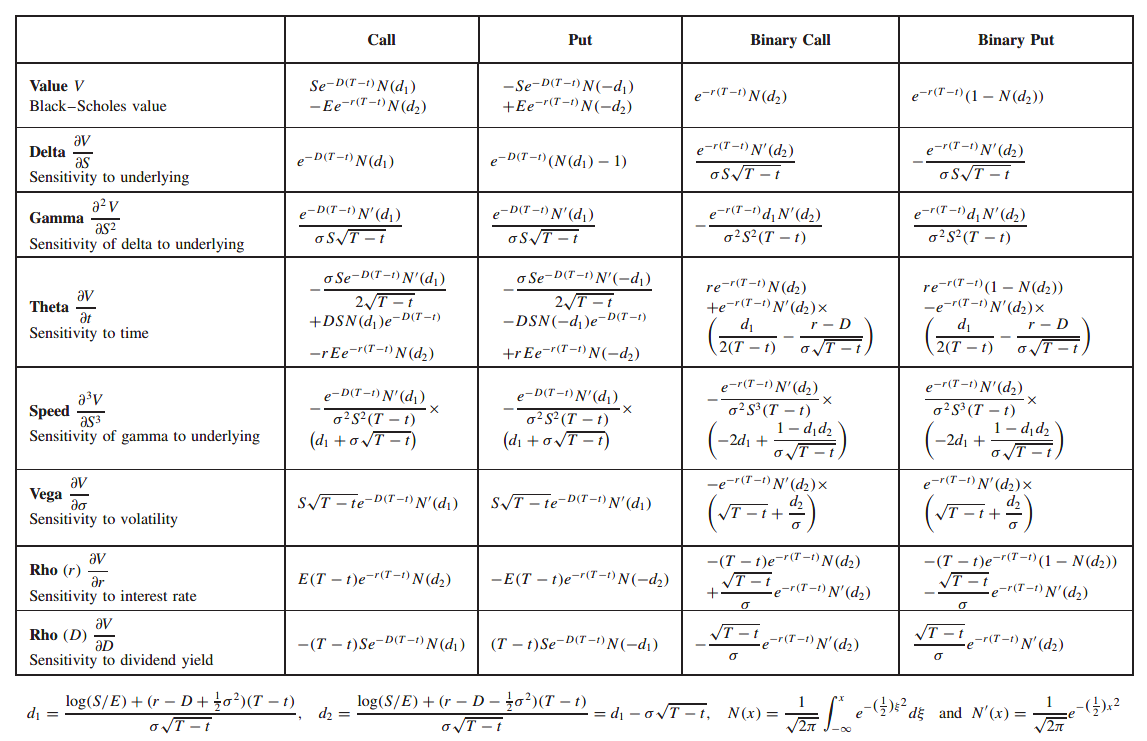 the derivation of the Black-Scholes formulae for calls, puts and simple digitals the meaning and importance of the ‘greeks,’ delta, gamma, theta, vega and rho the difference between differentiation with respect to variable and to parameters formulae fo